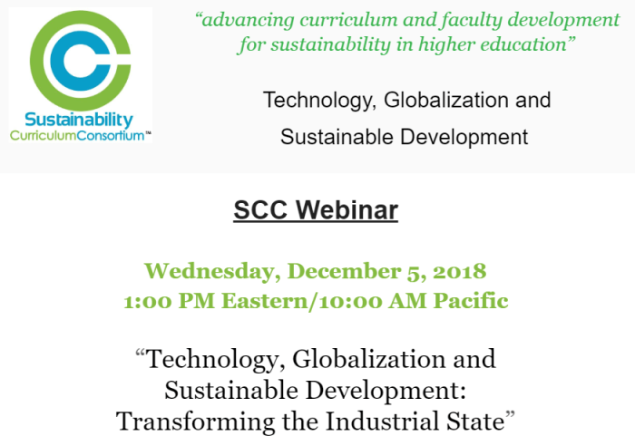 On December 5 at 1pm (EST), Prof. Ashford and I will be giving a webinar on our revised textbook as part of the Sustainability Curriculum Consortium (SCC) webinar series. During the webinar we will explore the central ideas covered in the textbook and discuss how we teach such a comprehensive range of theories, subjects, and approaches to advancing sustainable development.