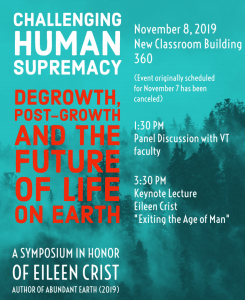 On Friday, November 8, I will be taking part in a symposium in honor of Eileen Crist, the author of Abundant Earth: Toward an Ecological Civilization. The symposium is tilted Challenging Human Supremacy: Degrowth, post-growth, and the future of life on earth.
