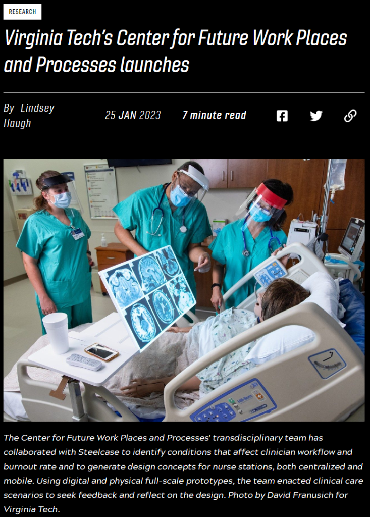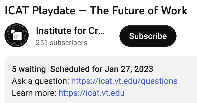 At 9am (EST) on Friday, January 27, we will launch the new Virginia Tech Center for the Future of Work Places and Practices at the ICAT Playdate. Information on how to join this event (in person or via YouTube) can be found by selecting the first image below. The second image below will take you to a news story about the new center.