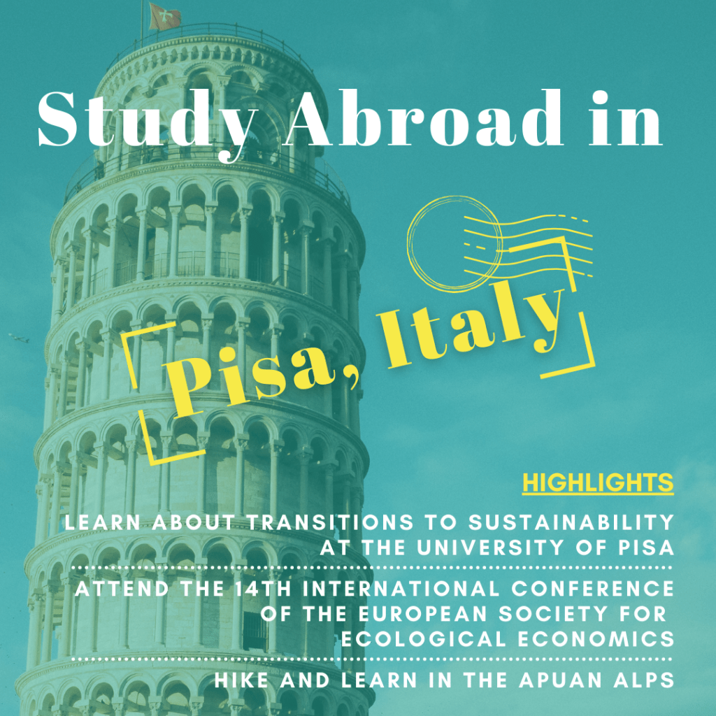 This is the final call for students interested in the Pisa, Italy, study abroad program. This unique study abroad program will provide students with a transdisciplinary perspective on sustainable development and is intended for rising seniors and graduate students interested in planning, policy, economics, business, innovation, environmental studies, and law. The program will explore the many dimensions of sustainability and how national, multinational, and international political and legal mechanisms can be used to further a transition towards sustainable development.