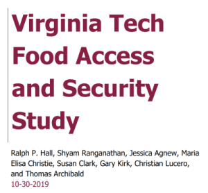 Hall, R. P., Ranganathan, S., Agnew, J., Christie, M. E., Kirk, G., Lucero, C., Clark, S. F., & Archibald, T. G. (2019). Virginia Tech Food Access and Security Study. Virginia Tech. http://hdl.handle.net/10919/95218