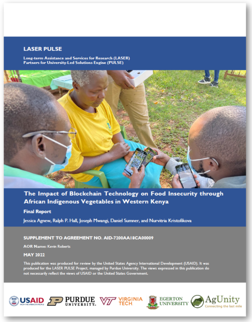 Agnew, J., Hall, R. P., Mwangi, J., Sumner, D., & Kristofikova, N. (2022). The Impact of Blockchain Technology on Food Insecurity through African Indigenous Vegetables in Western Kenya: Final Report. USAID LASER PULSE, 73 pages. http://hdl.handle.net/10919/110444