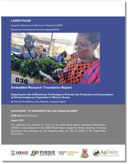 Agnew, J., & Hall, R. P. (2022). Policy Brief: Research evidence of the impacts of blockchain technology on improving food security through African Indigenous Vegetables in Western Kenya. USAID LASER PULSE, 4 pages. http://hdl.handle.net/10919/111580
