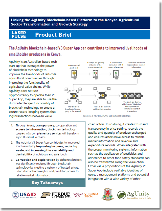 Agnew, J., Hall, R. P., & Kristofikova, N. (2022). Product Brief: Linking the AgUnity Blockchain-based Platform to the Kenyan Agricultural Sector Transformation and Growth Strategy. USAID LASER PULSE, 4 pages, 4 pages. http://hdl.handle.net/10919/111581