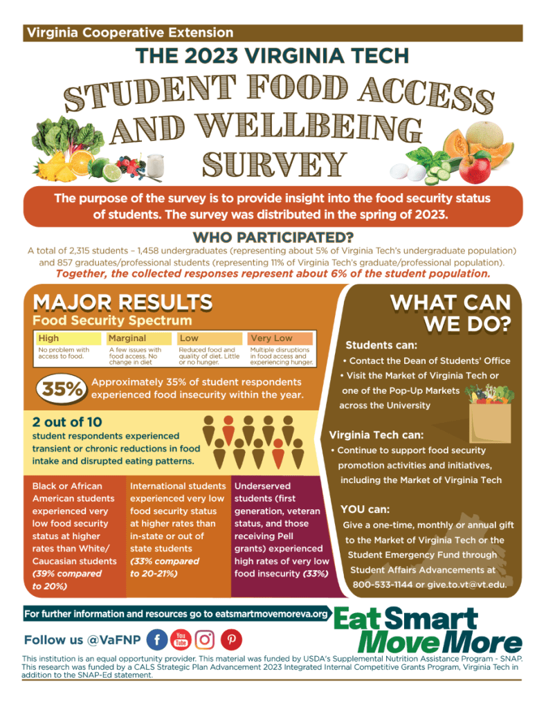 Holmes, C., Misyak, S., & Hall, R. P. (2024). The 2023 Virginia Tech Student Food Access and Wellbeing Survey. Infographic. Virginia Cooperative Extension, Eat Smart, Move More, Blacksburg.