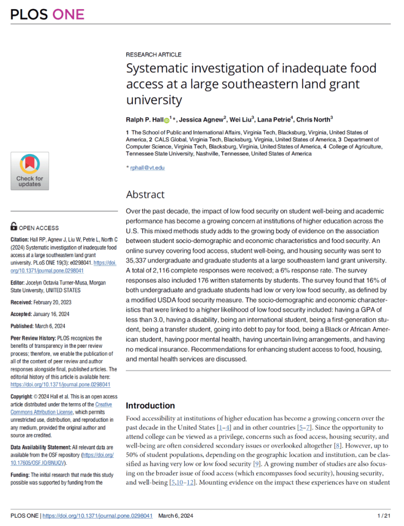 Hall, R. P., Agnew, J., Liu, Wei, Petrie, L., and North, C. (2024). Systematic investigation of inadequate food access at a large southeastern land grant university. PLoS ONE 19(3): e0298041. https://doi.org/10.1371/journal.pone.0298041