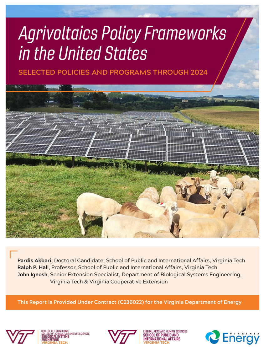 Akbari, P., Hall, R. P., & Ignosh, J. (2026). Agrivolatics Policy Frameworks in the United States: Selected Policies and Programs through 2024. Virginia Tech, Blacksburg. https://hdl.handle.net/10919/141096