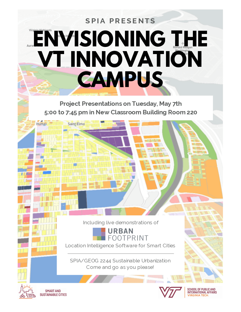 From 5:00 to 7:45pm on May 7, 16 teams of students (in SPIA/GEOG 2244 Sustainable Urbanization) will be presenting their projects that envision the VT Innovation Campus. The presentations will be held in room 220 in the New Classroom Building and will consist of a poster, handout, and a live demonstration of how they have analyzed their ideas using UrbanFootprint.