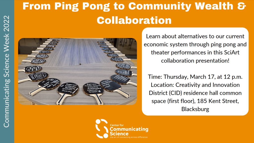 If you would like to know how ping ping and community wealth building are connected, please join us at 12pm on Thursday, March 17, at the new Creativity and Innovation District build at Virginia Tech.