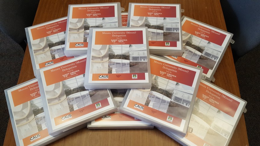 During the past year, four faculty and around 20 students in the School of Architecture + Design have developed three conceptual designs for a new Mzuni library (see the images on the front of the binders below). During their visit, the Mzuni delegation will explore each of these designs and connect with faculty across Virginia Tech who are supporting an effort to design a data analytics and visualization research+learning facility that could be located in the new library.
