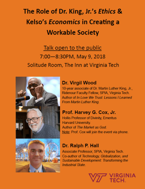On Wednesday, May 9, at 7:00pm, Dr. Virgil Wood (the 2018 VT Graduate Commencement Speaker), Prof. Harvey Cox (Hollis Professor of Divinity, Emeritus, Harvard University), and I will hold a public conversation on The Role of Dr. King, Jr.’s Ethics Kelso’s Economics in Creating a Workable Society. Prof. Cox will be joining the conversation via video conference.