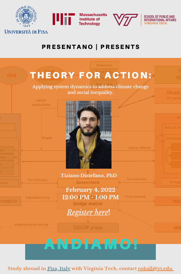 On Friday, February 4, from 12 – 1pm, Dr. Tiziano Distefano (University of Pisa, Italy) will talk about his research on applying system dynamics to address climate change and social inequality.