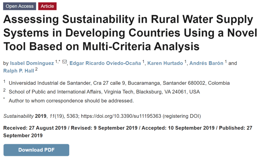 Just over a year ago, I reconnected with Isabel via a study she was hoping to publish with several colleagues. The challenge facing the research team was to develop a paper that described the process of creating a new rural water supply system (RWSS) assessment tool. Given Isabel’s help in shaping our MUS research in Colombia back in 2008, I was happy to join the team and help craft a paper that described their new tool.