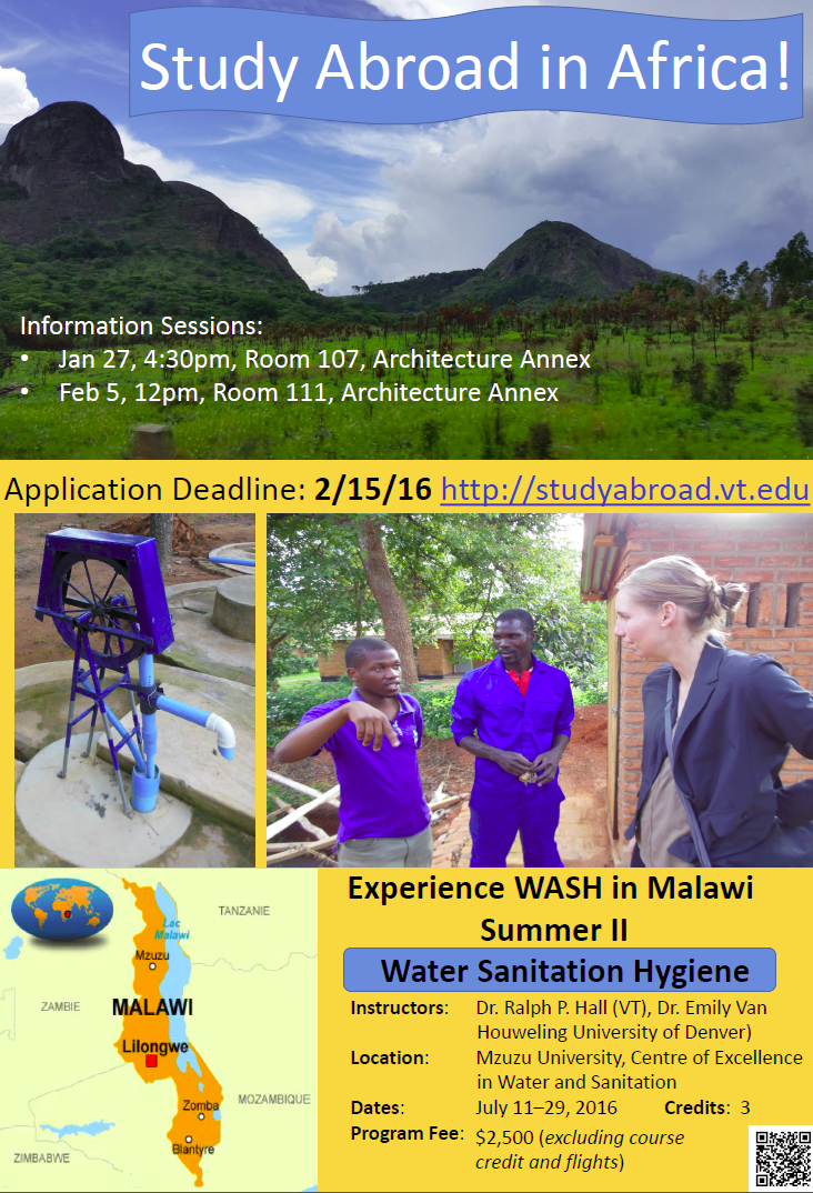 If you are a student at Virginia Tech, please consider applying to the Experience WASH in Malawi study abroad course. The course will run from July 11–29, 2016 (Summer II). The application deadline is February 1, 2016.
