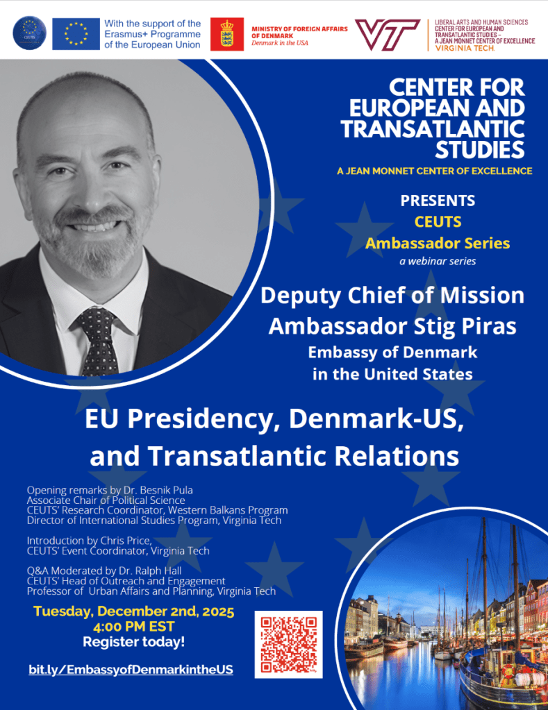 The Center for European and Transatlantic Studies (CEUTS) will hold the next installment of its Ambassador Series on December 2, 2025, at 4:00 PM (EST). Please join us to hear Ambassador Stig P. Piras, the Deputy Chief of Mission at the Embassy of Denmark in the United States, discuss the EU Presidency, Denmark–U.S. relations, and transatlantic relations.