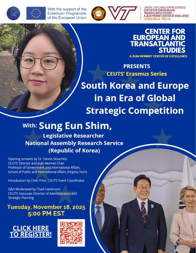 Our guest speaker will be Sung Eun Shim, a legislative researcher with the National Assembly Research Service of the Republic of Korea, who will deliver a lecture titled: “South Korea and Europe in an Era of Global Strategic Competition.”