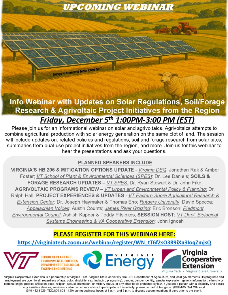 Please join us on Friday, December 5, 1:00–3:00 PM (EST) for an informational webinar exploring the intersection of agriculture and solar energy. Learn about: