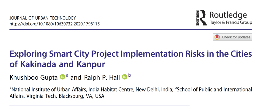 The final paper from Dr. Kushboo Gupta’s dissertation has been published in the Journal of Urban Technology. This new paper focuses on exploring smart city project implementation risks in the cities of Kakinada and Kanpur, India. The list below captures several other contributions by Dr. Gupta that stem from her PhD research: