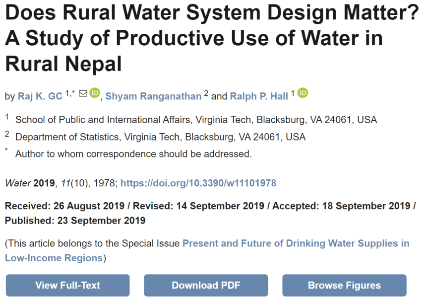 In 2012, I had the pleasure of meeting Raj GC at a Multiple-Use Water Services (MUS) retreat at the Rockefeller Foundation’s Bellagio Center in Italy. Raj is located on the top right of the picture below that was taken during the retreat. Four years later, Raj left his home in Nepal to join our PhD program in Planning, Governance, and Globalization (PGG) at Virginia Tech, to study the impacts of MUS in Nepal. On Monday, the first paper of his dissertation was published that explores whether the design of rural water systems in the mid-hills of Nepal impacts how households use water. The paper is open access (thanks to Virginia Tech’s Open Access Subvention Fund) and can be accessed by selecting the title of the paper below.